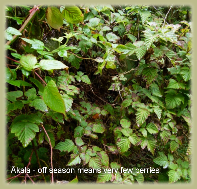 Our first endemic species is Ākala or Hawaiian Rasberry. It’s found between the 1,900 to 10,000-foot elevations. The Ākala is not very common except on Haleakalā*, especially in the Koʻolau* gap area. Its fruit is large and red and edible though sour and bitter. The birds LOVE these berries.