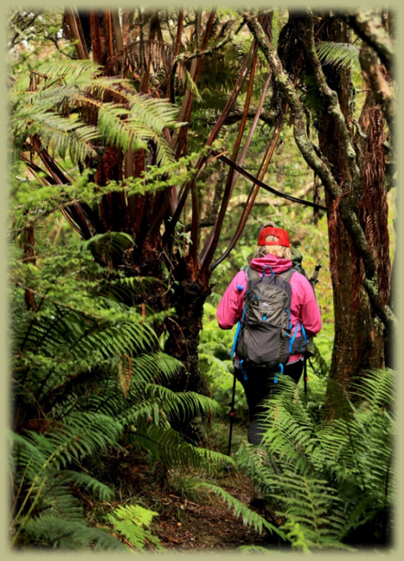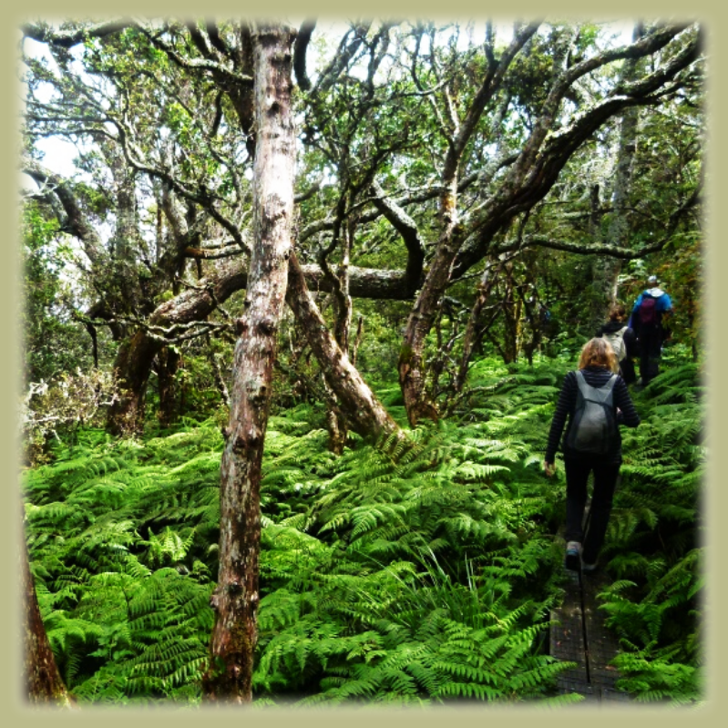As we continue on the trail, it becomes quite narrow, and we walk single file, embraced by thick branches and tree limbs, ferns sprinkled at our feet.