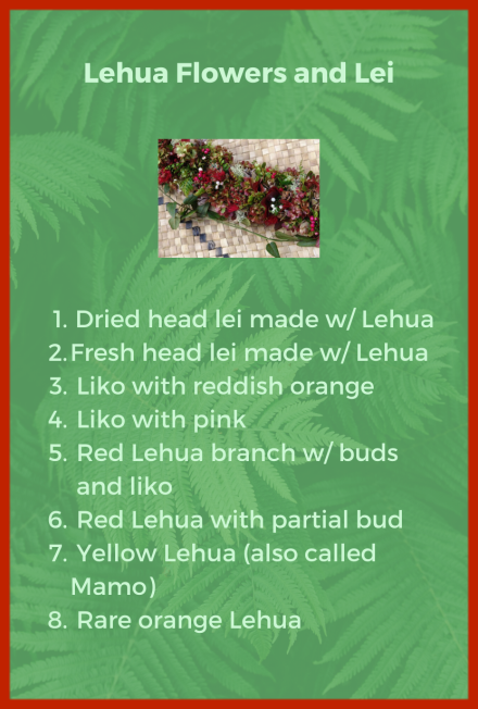 Equally important, beautiful lei* made with flowers, flower buds, and liko* is still a favorite lei today as they were in times of old. The lehua blossoms come in gorgeous shades of red, yellow, and orange.
