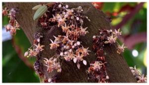 In our ideal environment, cacao trees are evergreens and never stop blooming.