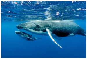 • Humpback whales depart the icy waters of Alaska in the fall for Hawai’i. They come to compete for a mate, to breed, to give birth, and to play. In Maui, the underwater visibility from the crystal clear water is exceptional. The variety of shallow (800’) and deep (18,000’) waters mixed with no natural predators gives them an ultimate safe space to raise and nurture their young calves safely.